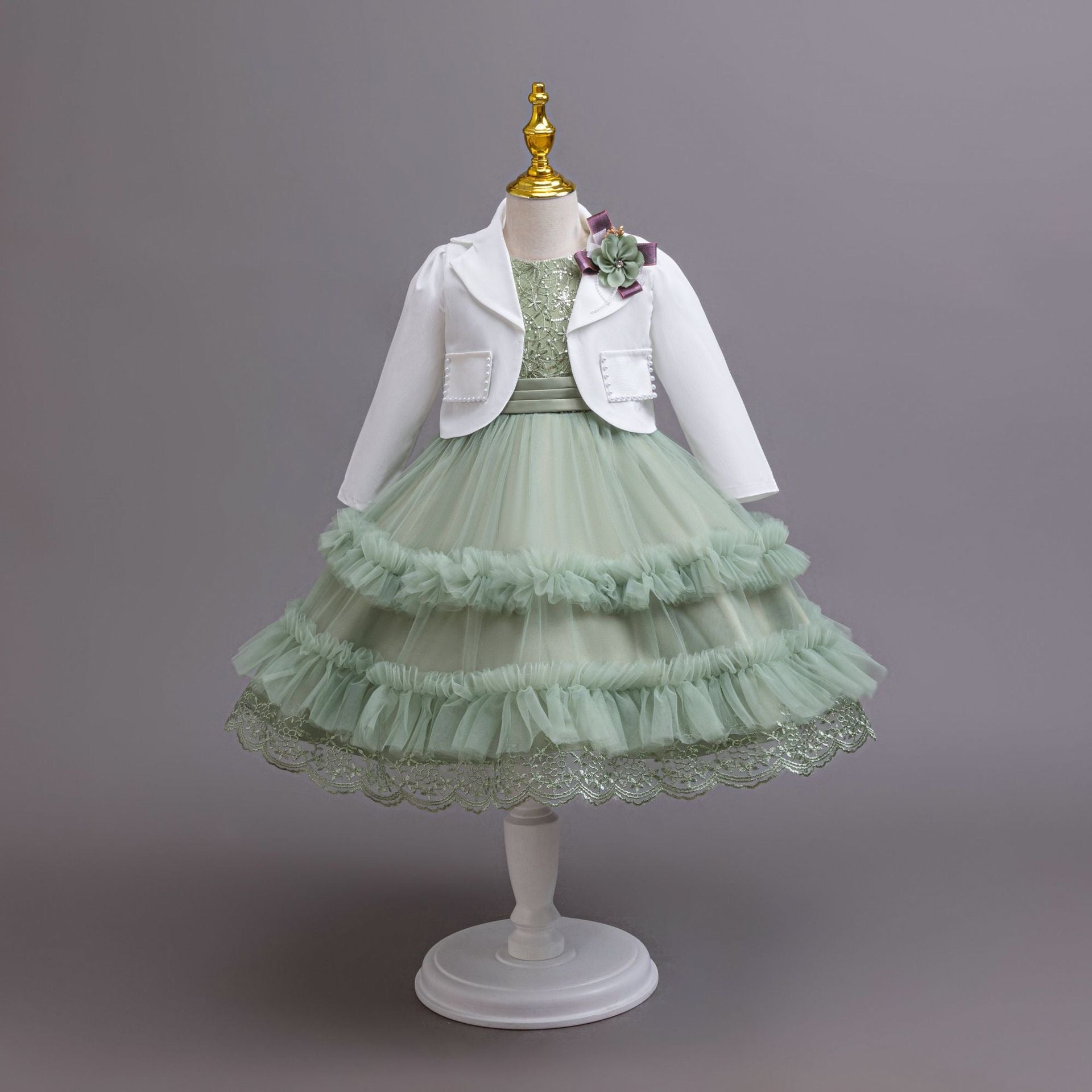 Robe de princesse en tulle décorée de dentelle pour jeunes filles, idéal pour anniversaire, baptême, mariage , avec veste inclus