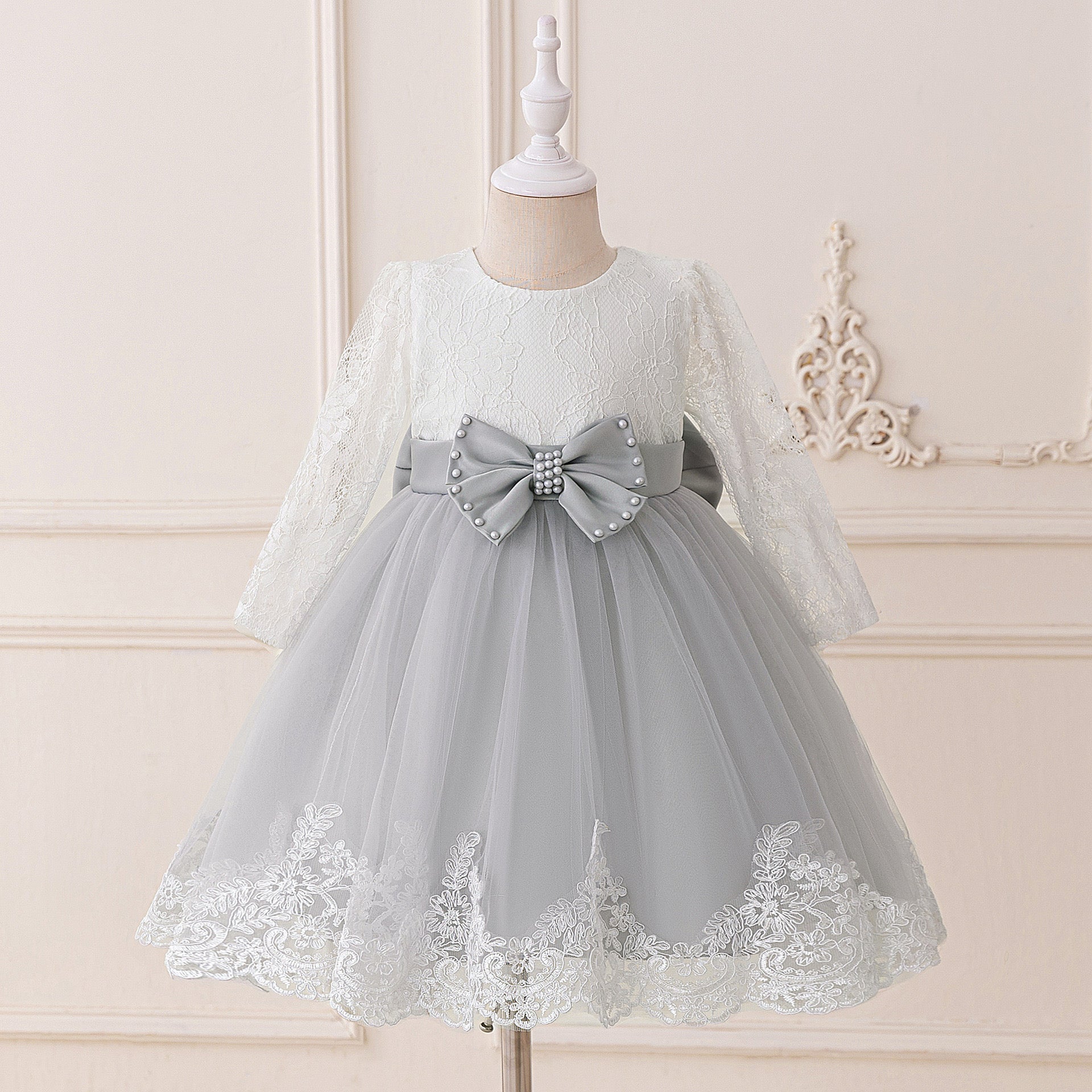 Robe pour fillles avec manche, en tulle et dentelle , avec nœud en avant, élégante et mignonne pour mariage, fête d'anniversaire.